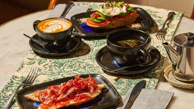 静かな時間帯の現代建築と優雅な朝食をお楽しみください。