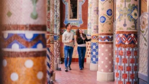 タイルによる花があしらわれた柱の間を歩く美しいバルコニーに加えて